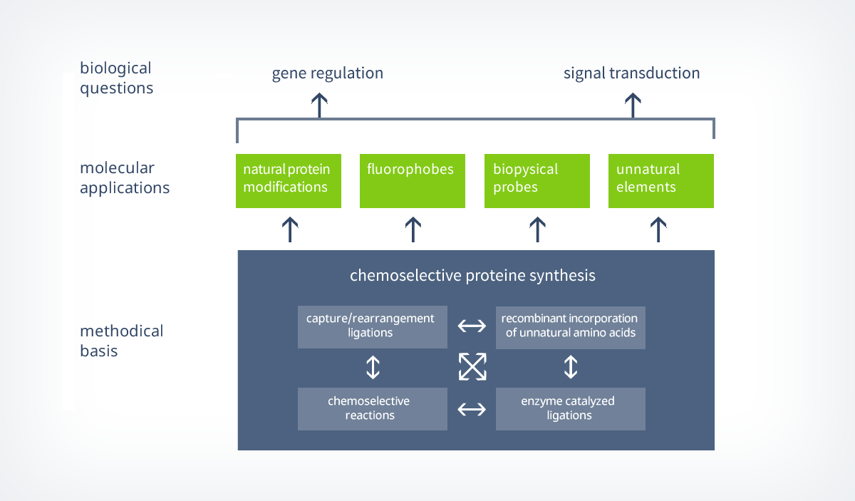 The priority program 1623 focuses on projects that use chemical methods for the generation of functional proteins. We develop new techniques that combine chemoselectiv reactions and modern molecular biology, by this means trying to tackle important biological questions. Within this cutting-edge research the major goals of the priority program are: